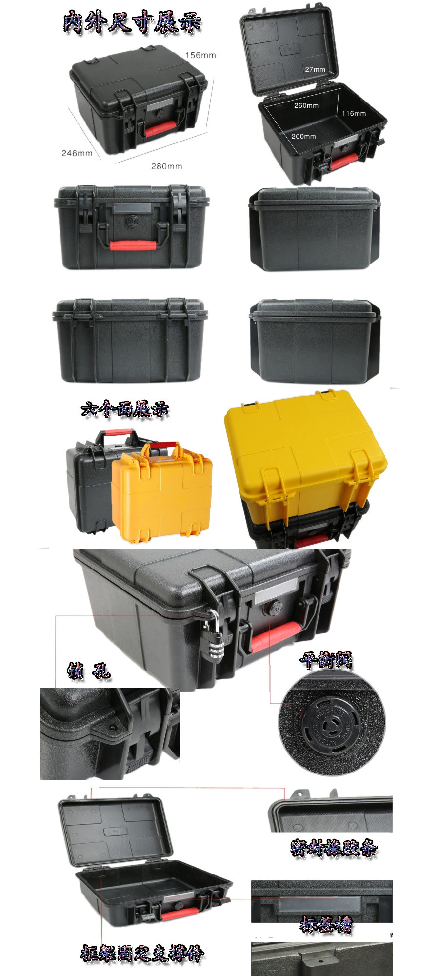 簡要說明:廣泛用于傳媒、公安、消防、軍隊、航空、戶外攝影、野外考察、科學探測等眾多領(lǐng)域的高端儀器、儀表。具有高強度、高抗壓沖擊、防潮、絕對密封、防塵、防水等特點。產(chǎn)品材質(zhì):ABS原料,箱體采用高抗沖擊的高分子聚合材料一體注塑成型,密封采用扁型彈性發(fā)泡密封橡膠條,確保防水氣密,所有較軸均采用不銹鋼材質(zhì)。