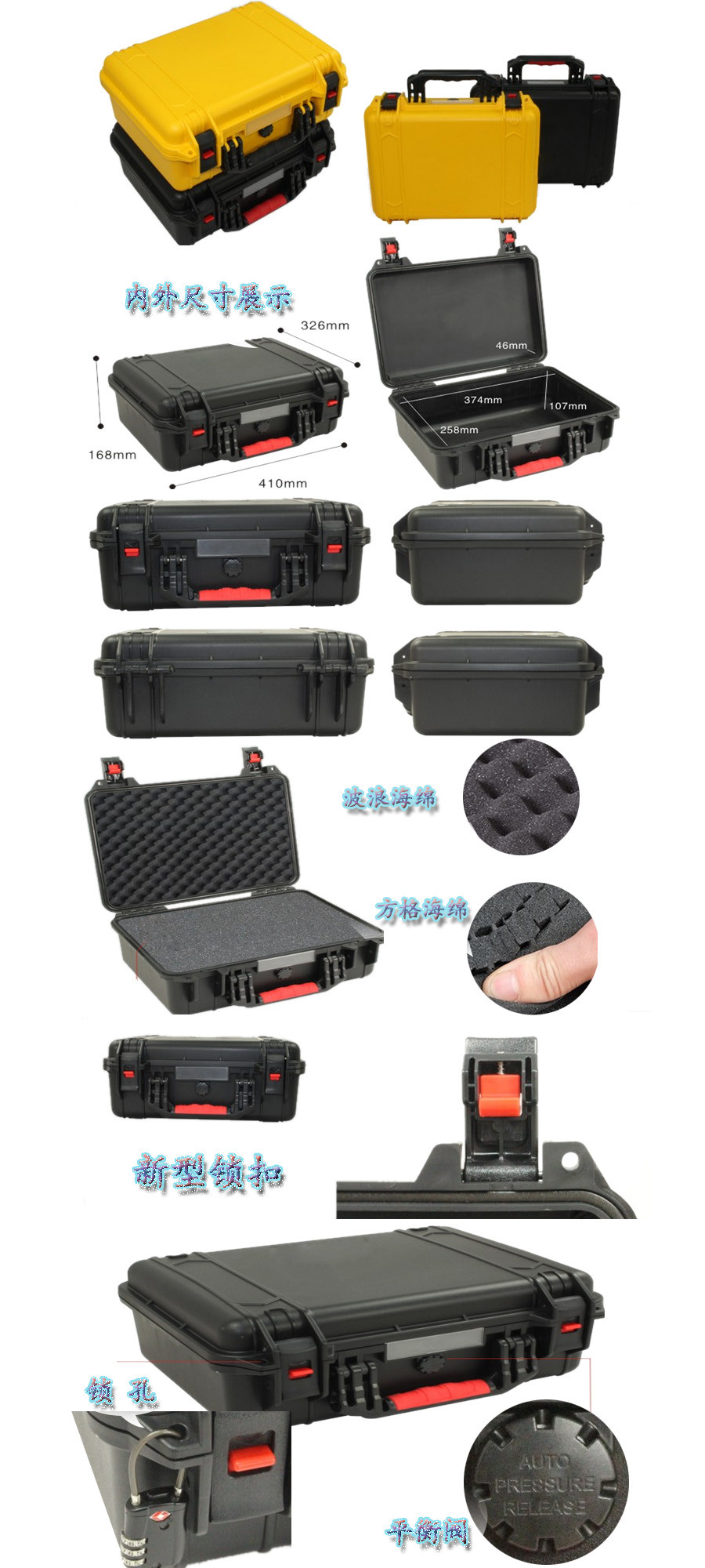 簡(jiǎn)要說明:廣泛用于傳媒、公安、消防、軍隊(duì)、航空、戶外攝影、野外考察、科學(xué)探測(cè)等眾多領(lǐng)域的高端儀器、儀表。具有高強(qiáng)度、高抗壓沖擊、防潮、絕對(duì)密封、防塵、防水等特點(diǎn)。產(chǎn)品材質(zhì):ABS原料,箱體采用高抗沖擊的高分子聚合材料一體注塑成型,密封采用扁型彈性發(fā)泡密封橡膠條,確保防水氣密,所有較軸均采用不銹鋼材質(zhì)。